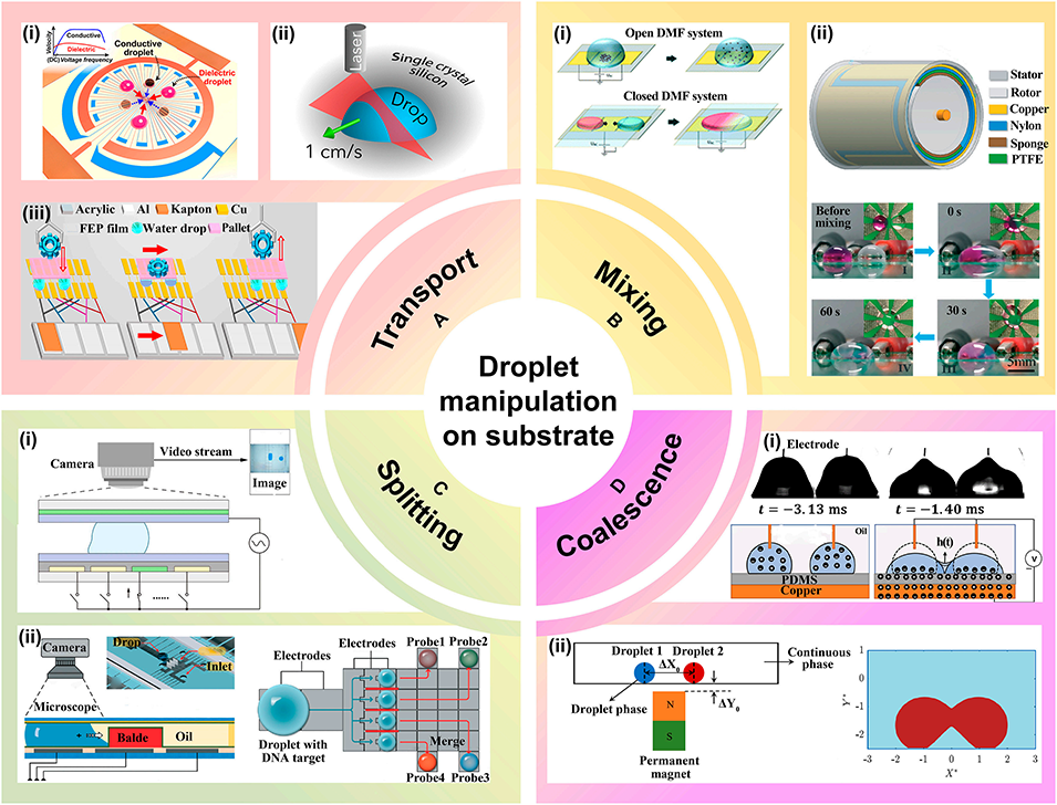 图5: 基底上的液滴操控(数字微流控)。展示了在平面基底上对离散液滴的操控:A. 输运:通过电润湿、光致电润湿或TENG驱动实现液滴的定向移动。B. 混合:利用电致流体动力学或TENG驱动的介电泳实现液滴混合。C. 分裂:采用AI辅助识别或3D微刀片结构进行精确分裂。D. 融合:通过电润湿或磁场诱导液滴合并。