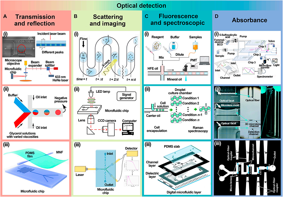 图6: 光学检测方法。总结了各类光学检测技术:A. 透射与反射检测:用于分析液滴内部成分(如凝血检测)或表面特性。B. 散射与成像检测:结合X射线衍射或动态光散射分析颗粒分布与形态。C. 荧光与光谱检测:用于高灵敏度生物标记物检测(如酶活性)和拉曼光谱分析。D. 吸光度检测:基于比尔-朗伯定律对液滴内物质进行定量分析。