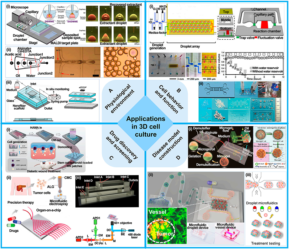 图11: 在3D细胞培养中的应用。A. 生理环境:模拟体内环境,如进行液滴微萃取、生成核壳颗粒、集成纳米纤维支架。B. 细胞行为与功能:实时监测细胞间通讯和细胞迁移。C. 药物发现与筛选:用于3D肿瘤球培养、高通量药物评估。D. 疾病模型构建:构建血管化肿瘤模型、生成均一肿瘤球体。