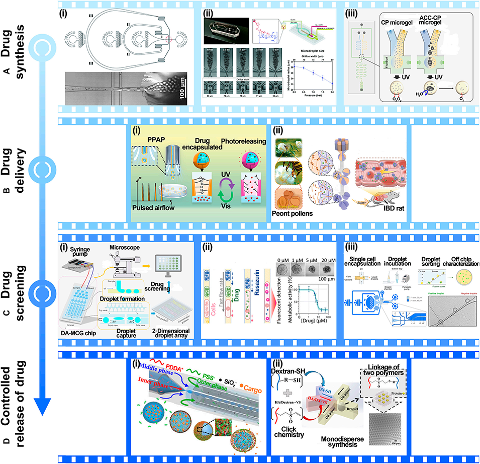 图12: 在药物开发中的应用。A. 药物合成:制备智能响应型纳米药物微胶囊、单分散纳米粒、释氧微凝胶。B. 药物递送:制造光控微胶囊、花粉状多叶形粘附微粒用于靶向给药。C. 药物筛选:利用浓度梯度液滴阵列、自动化平台进行高通量筛选。D. 药物控制释放:制备能响应pH、渗透压等刺激的微胶囊和水凝胶微球。