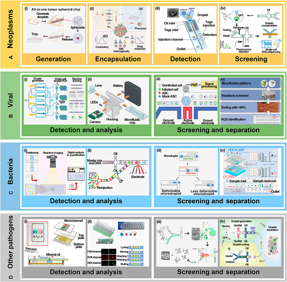 图13: 在疾病防治中的应用。A. 肿瘤:用于生成3D肿瘤球、构建患者特异性肿瘤模型、检测外泌体、筛选抗原特异性T细胞。B. 病毒:进行单细胞多重HPV检测、高通量病毒中和抗体筛选、单病毒颗粒分析。C. 细菌:实时监测活菌、CRISPR快速检测、基于变形性筛选细菌。D. 其他病原体:集成化检测芯片用于多重核酸分析、真菌酶活性筛选。
