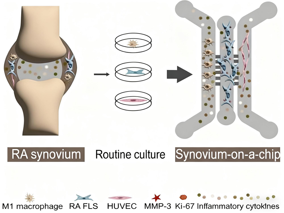 近期,中日友好医院肖诚研究员、中国农业科学院许柠博士等人整合微流控芯片、3D培养与流动培养技术,开发了一种新型血管化滑膜芯片模型。该模型通过将RA患者来源的FLSs与M1型巨噬细胞、人脐静脉内皮细胞在优化比例下进行3D动态共培养,成功模拟了体内滑膜的慢性炎症微环境,并证实其在药物疗效与毒性评估方面的独特优势。相关研究以“Synovium-On-A-Chip: Simulating the Microenvironment of the Rheumatoid Arthritis Synovium via Multicell Interactions to Target Fibroblast-Like Synoviocytes”为题,发表于期刊《Advanced Science》。