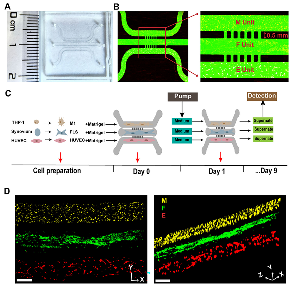 图1:RA滑膜芯片模型的构建。A:芯片的实体照片。B:芯片三个通道的共聚焦显微镜图。中间通道为成纤维样滑膜细胞(FLSs, F单元),两侧通道分别为M1型巨噬细胞(M单元)和人脐静脉内皮细胞(HUVECs, E单元)。C:模型培养示意图。第0天将三种细胞分别接种到对应通道,第1天开始以3 µL/h的流速进行灌注培养。D:三种细胞在芯片内成功进行3D共培养的共聚焦显微镜图像(黄色:M1巨噬细胞,绿色:RA FLSs,红色:HUVECs)。