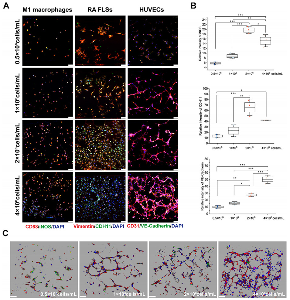 图2:三种细胞接种密度的优化。A-B:通过免疫荧光染色评估不同接种密度下各细胞的功能标志物表达。结果显示,RA FLSs(标志物Cadherin-11)和M1巨噬细胞(标志物iNOS)在密度为 2×106 cells/mL时功能蛋白表达最强。HUVECs(标志物VE-Cadherin)的表达则随密度增加而增强。C:3D成像显示,HUVECs在 0.5×106 cells/mL时无法成管,在 1×106 cells/mL及以上密度时可形成血管网络,且管腔直径随密度增加而减小。最终确定RA FLSs和M1巨噬细胞的优化密度为 2×106 cells/mL。