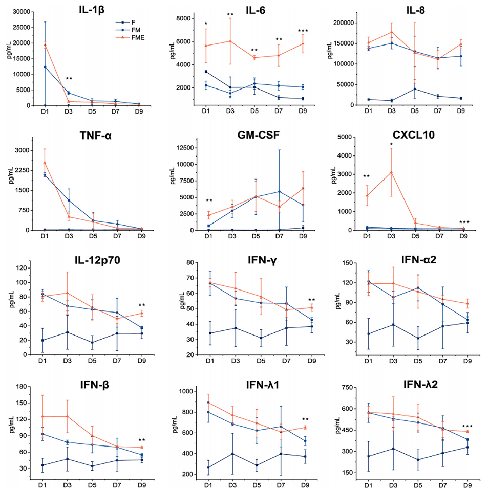 图4:滑膜芯片模型中炎症因子表达的动态分析。该图展示了在9天培养期内,FME三细胞共培养组相比FM两细胞共培养组,能持续维持更高水平的多种炎症因子(如IL-6, IL-8, CXCL10, GM-CSF等),且表达相对稳定,证明了模型可长期保持高炎症状态。