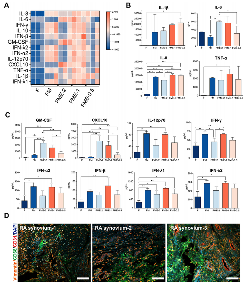 图3:通过炎症特征评估优化三种细胞的接种比例。A-C:检测不同共培养比例组(F单培养、FM 1:1、FME-2 1:1:2、FME-1 1:1:1、FME-0.5 1:1:0.5)的炎症因子水平。发现三细胞共培养(FME)能产生更强的炎症反应。综合考虑IL-6、IL-8等关键因子水平,FME-1(1:1:1)和FME-2(1:1:2)表现出优势。D:对RA患者滑膜组织进行多重免疫荧光染色(Vimentin, CD68, CD31),显示体内三种细胞的相对比例,为确定体外1:1:1的比例提供了临床依据。