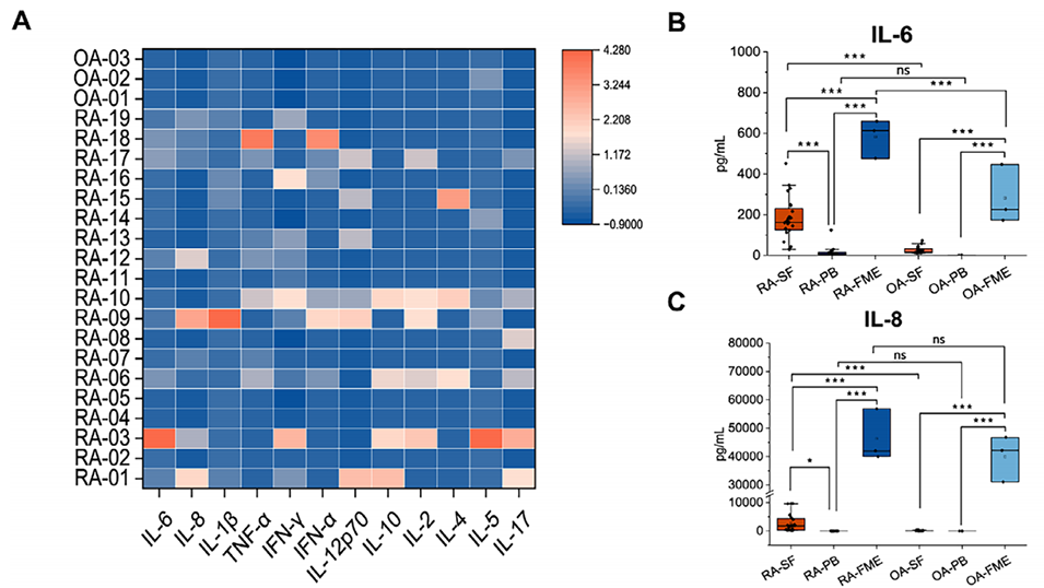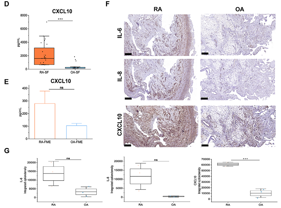 图5:RA与OA患者临床样本中炎症因子水平的分析。A:RA与OA患者外周血中多种炎症因子的热图。B-E:定量分析显示,RA患者滑液(SF)中的IL-6、IL-8和CXCL10水平显著高于其自身外周血(PB)及OA患者的滑液。更重要的是,利用RA患者原代细胞构建的芯片模型(RA-FME)中这些因子的水平甚至高于临床滑液样本。F-G:免疫组化证实IL-6、IL-8和CXCL10在RA患者滑膜组织中的表达显著高于OA组织。