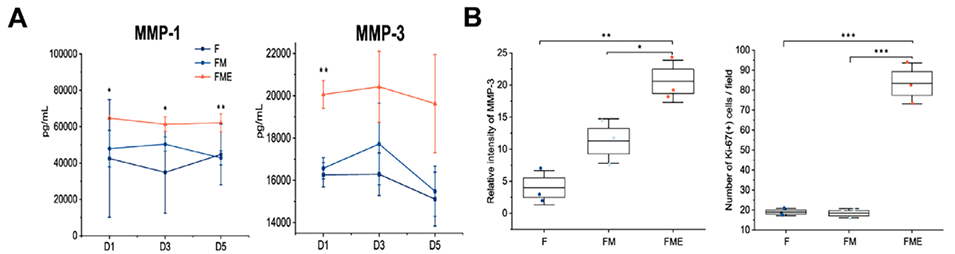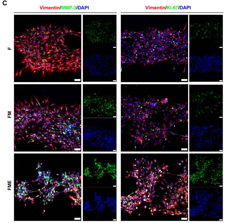 图6:分析RA FLSs在芯片模型中的侵袭能力与增殖特性。A:ELISA检测显示,三细胞共培养组(FME)中基质金属蛋白酶MMP-1和MMP-3的水平显著高于两细胞共培养组(FM),表明其侵袭能力更强。B-C:免疫荧光染色和定量分析进一步证实,RA FLSs的MMP-3(侵袭标志)和Ki-67(增殖标志)表达在FME组中最高,说明M1巨噬细胞和内皮细胞共同增强了RA FLSs的病理特性。