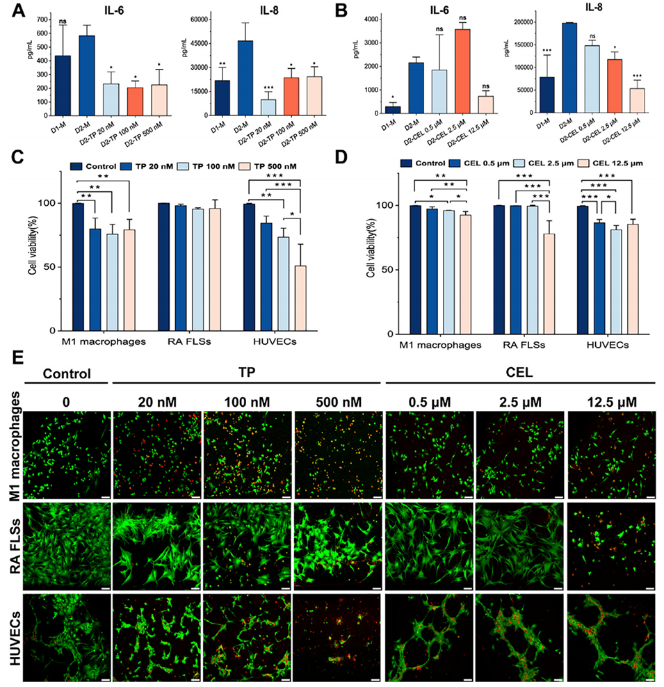 图7:在滑膜芯片模型中评估药物(TP和CEL)的疗效与毒性。A-B:药效评估:TP和CEL能剂量依赖性地显著降低模型中的IL-6和IL-8水平。C-E:毒性评估:活死染色显示,TP对RA FLSs毒性较小,但对M1巨噬细胞和HUVECs有显著毒性;而CEL对三种细胞均有明显毒性。这证明了该模型能够同时且分别评估药物对不同细胞类型的毒性。