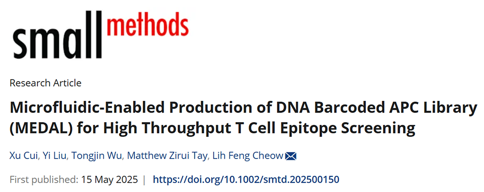 近期,新加坡国立大学Cheow Lih Feng团队开发了一种名为微流控驱动的DNA条形码APC文库(MEDAL)的高通量技术,该技术通过微流控液滴平台整合液滴PCR、体外转录翻译(IVTT)与DNA条形码标记,可在10小时内制备并筛选多达9000种不同的DNA条形码抗原呈递细胞(APCs),有效实现高亲和力肽序列识别与T细胞特异性表位筛选。相关研究以“Microfluidic-Enabled Production of DNA Barcoded APC Library (MEDAL) for High Throughput T Cell Epitope Screening”为题,发表于期刊《Small Methods》。