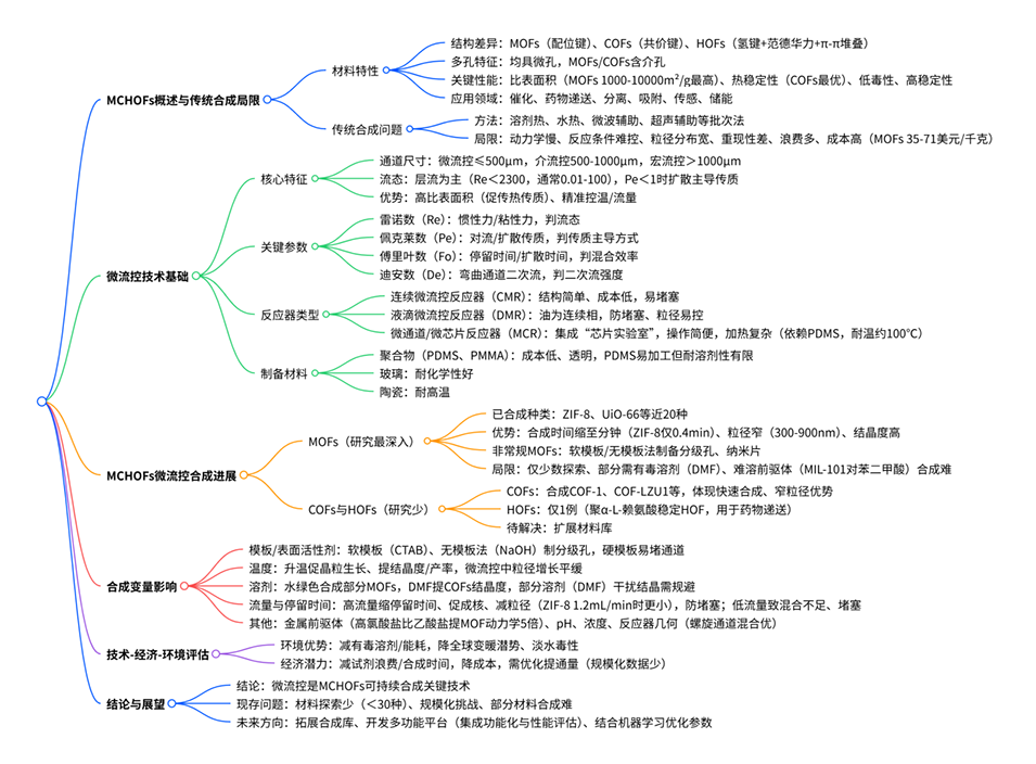 2、深入探讨了MCHOFs合成的化学原理、传统合成方法及其局限性、微流控技术在MCHOFs合成中的应用进展、合成变量,以及微流控合成在技术-经济-环境层面的意义。