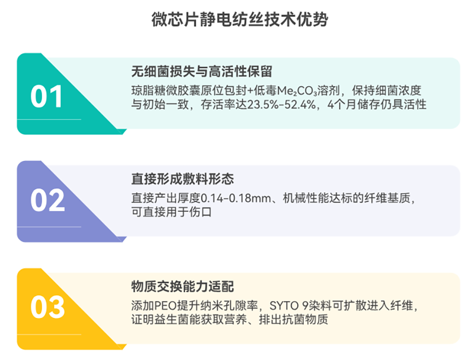 1、本研究开发了一种创新的微芯片静电纺丝技术,将微流控芯片与静电纺丝相结合,制备出含有活性益生菌的纤维基质。