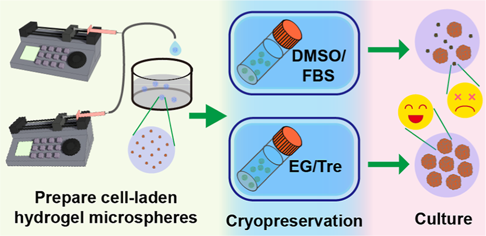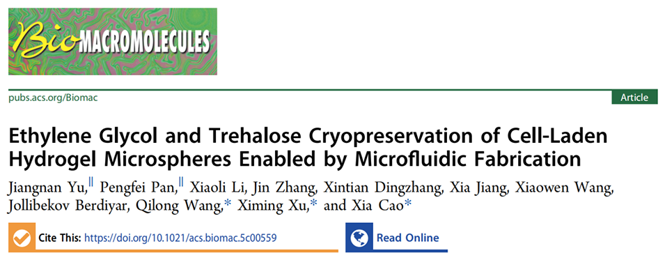 载细胞水凝胶微球在3D细胞培养应用中引起了广泛关注,但这些系统的有效冷冻保存方法仍未得到充分探索。为此,江苏大学药学院徐希明教授、曹霞副教授、王启龙等人开发了一种可快速制备单分散载细胞水凝胶微球的简易微流控装置,并成功探索出一种基于乙二醇与海藻糖的无DMSO/FBS冷冻保存策略。结果表明,该策略不仅能大幅提升多种细胞在复苏后的存活率,还能有效避免传统冷冻保护剂引起的细胞凋亡,并维持干细胞的多能性。相关研究以“Ethylene Glycol and Trehalose Cryopreservation of Cell-Laden Hydrogel Microspheres Enabled by Microfluidic Fabrication”为题目,发表于期刊《Biomacromolecules》。