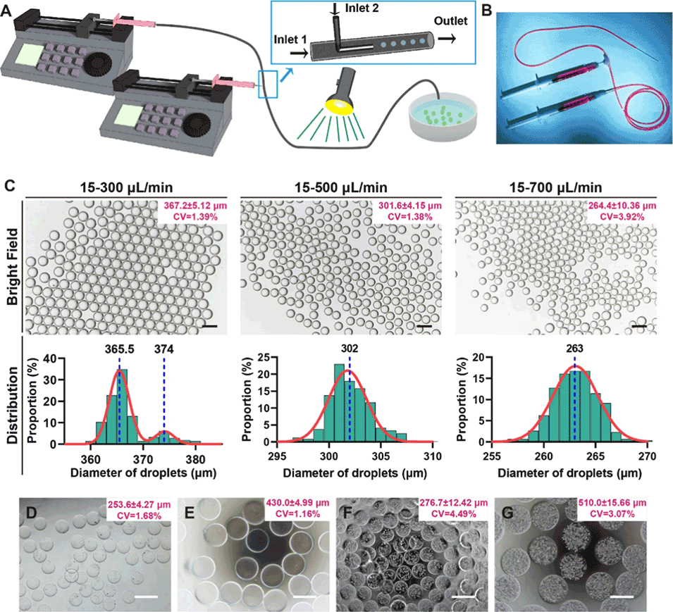 1、本研究开发了一种微流控平台,用于制备单分散、负载细胞的甲基丙烯酰化明胶(GelMA)和海藻酸钙(ALG)水凝胶微球,细胞存活率高。