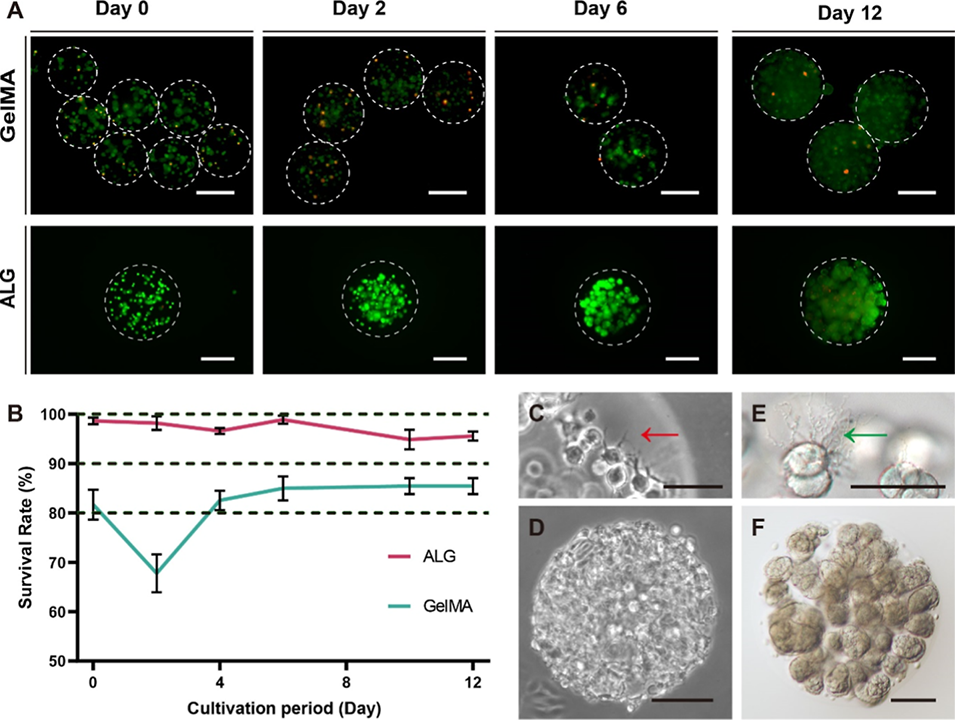 图2. 包封于甲基丙烯酰化明胶(GelMA)或海藻酸钙(ALG)微球中的 U251 细胞保持高存活率