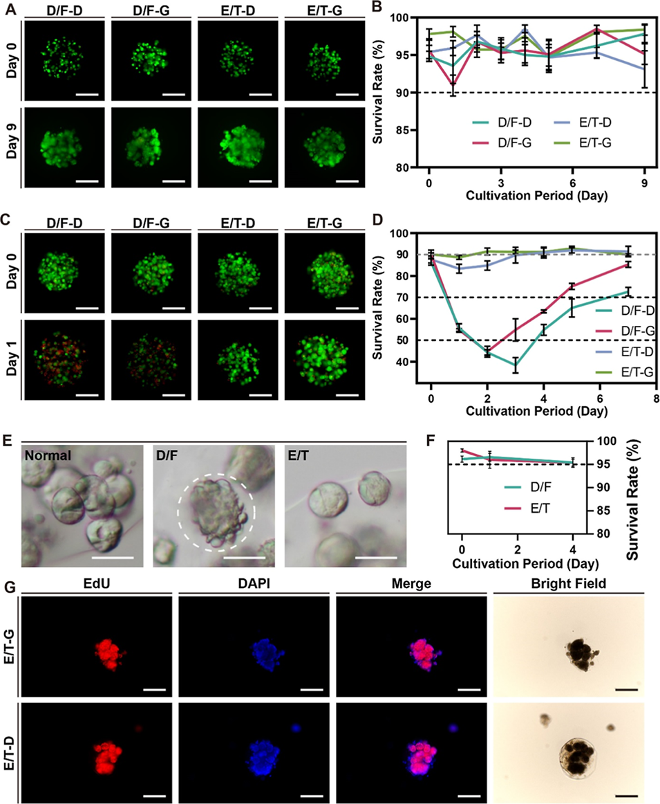 图5. 乙二醇/海藻糖(E/T)实现载细胞微球的无二甲基亚砜(DMSO)、无胎牛血清(FBS)冷冻保存