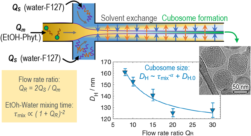 立方体脂质纳米颗粒作为脂质反相双连续立方相的胶体分散体系,因兼具疏水与亲水区域,在药物递送领域潜力巨大,但传统方法难实现尺寸均一与可调。近期,有研究人员提出一种基于微流控流体聚焦的溶剂交换方法,可实现立方体脂质纳米颗粒的尺寸可控制备,该方法通过调节水- F127侧流与植烷三醇-乙醇前驱体的流速比(QR)将颗粒尺寸从195 nm调控至125 nm,且产物经表征证实为Pn3m空间群的立方相结构,性能显著优于传统批量溶剂交换法。相关研究以“Microfluidic Flow-Focusing for Size-Controlled Formation of Cubosomes”为题目,发表于期刊《Langmuir》。