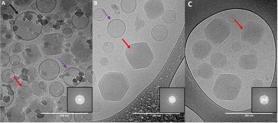 图3. 显示立方体脂质纳米颗粒与囊泡共存的冷冻透射电子显微镜(Cryo-TEM)图像。A、B、C 图分别对应流速比(QR)为 8、10、15 时形成的样品:红色箭头标注部分立方体脂质纳米颗粒,黑色箭头和紫色虚线箭头分别指向完全包裹和部分包裹于约 7 nm 厚暗扩散区域中的囊泡;插图为所选区域(红色箭头处)的二维快速傅里叶变换(2D FFT)图,可清晰显示周期性结构的存在。所有图像的比例尺均为 250 nm。