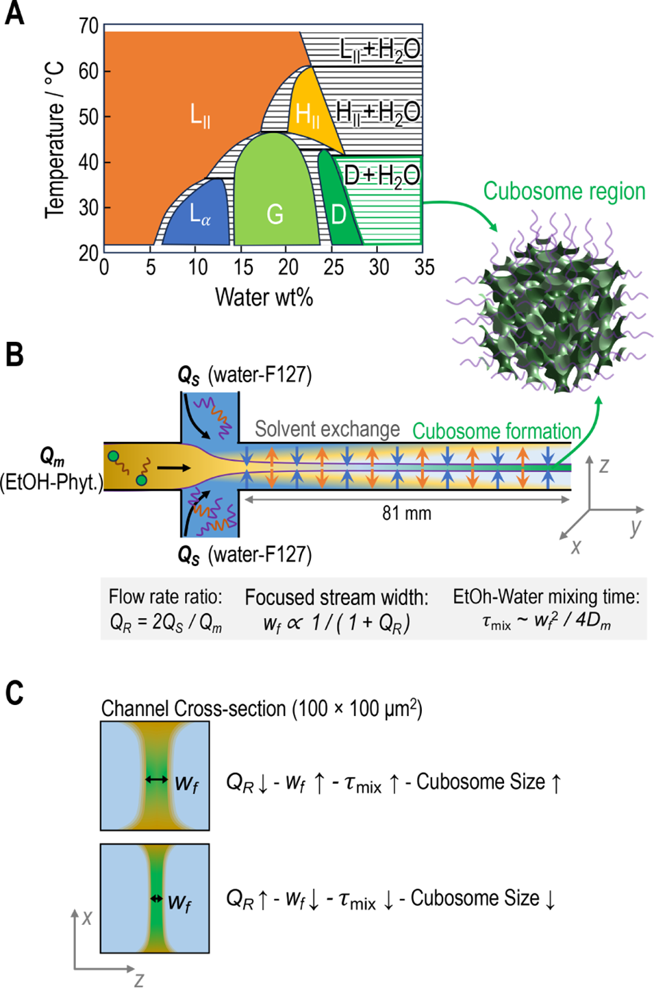 图1. 用于组装尺寸可控立方体脂质纳米颗粒的微流控溶剂交换方法示意图