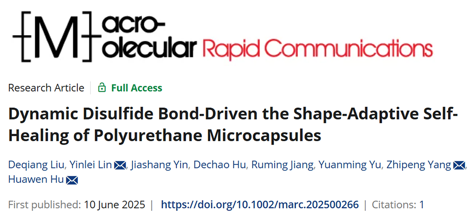 近期,佛山大学户华文教授、林殷雷副教授、杨志鹏博士等人成功研制出一种基于动态二硫键的本征自修复聚氨酯微胶囊。该类微胶囊在受损后,能先通过形状记忆效应闭合伤口,再利用二硫键的交换反应实现高效愈合,解决了传统微胶囊无法重复修复的难题。相关研究以“Dynamic Disulfide Bond-Driven the Shape-Adaptive Self-Healing of Polyurethane Microcapsules”为题,发表于期刊《Macromolecular Rapid Communications》。