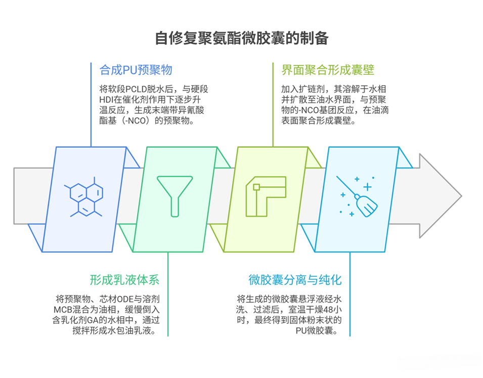1、本研究针对传统异氰酸酯微胶囊修复剂自修复能力有限的问题,提出了一种新型聚氨酯微胶囊(PU1)设计。