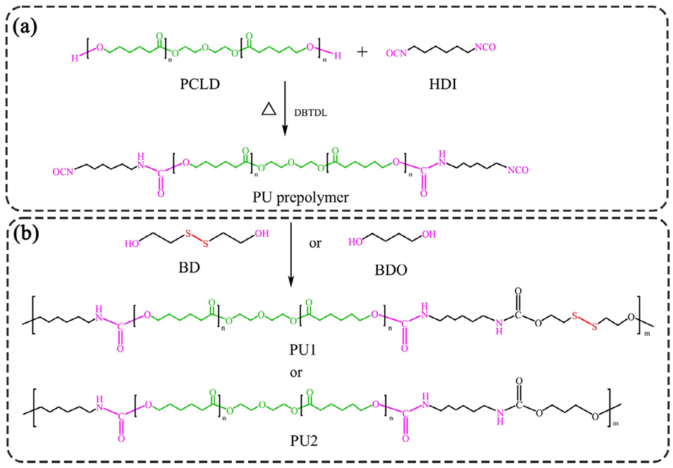 图2. a)PU预聚物及b)PU1与PU2的合成路线
