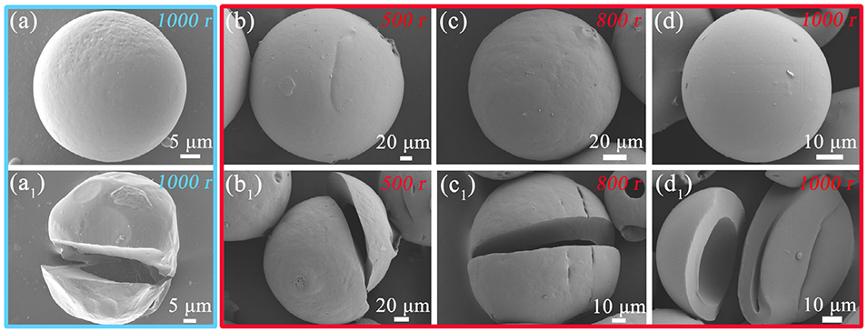 图5. a, a1)搅拌速率为800 rpm时制备的PU2微胶囊SEM图(a)及其对应的壳层结构(a1);b-d, b1-d1)搅拌速率分别为500 rpm(b)、800 rpm(c)、1000 rpm(d)时制备的PU1微胶囊SEM图及其对应的壳层结构(b1-d1)