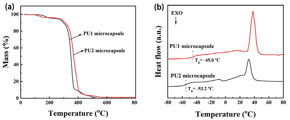 图4. a)PU1与PU2微胶囊的TG曲线及b)DSC曲线