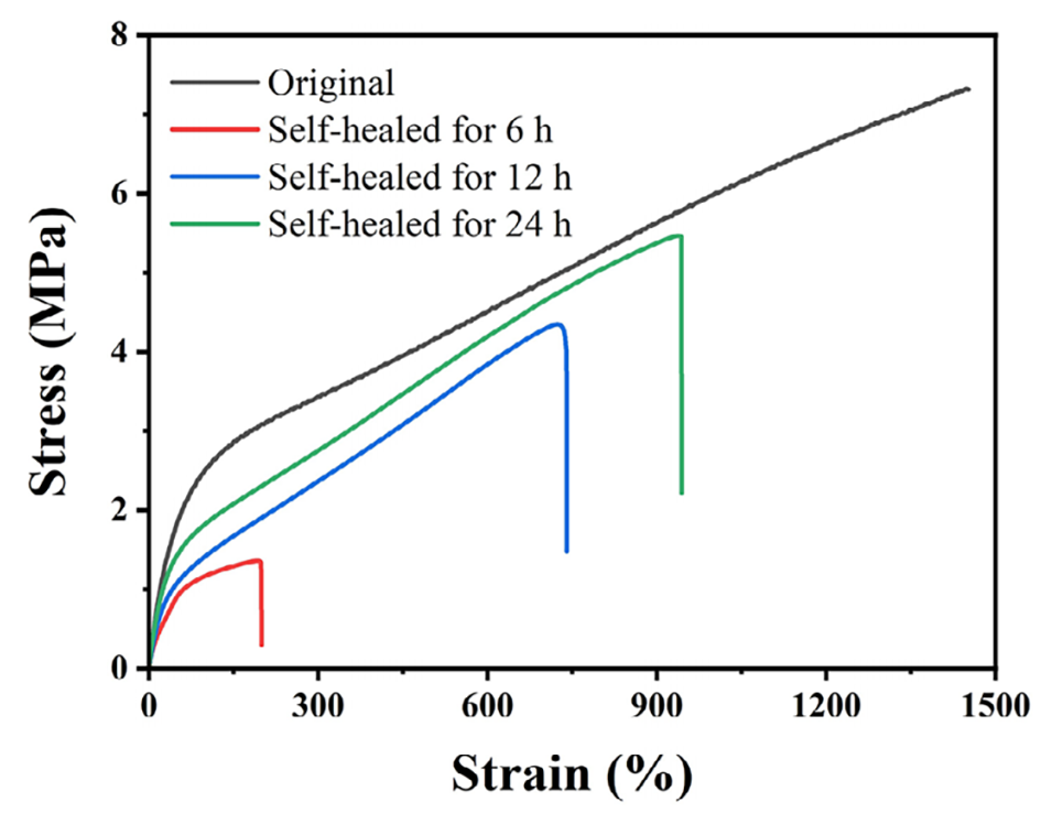 图9. 弹性体自愈前后的应力-应变曲线