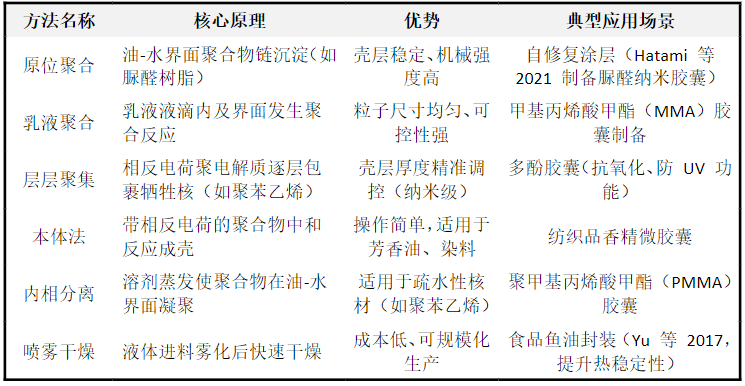 3、文章深入探讨了多种微胶囊化技术,包括喷雾干燥、乳液法以及微流控、气溶胶等新兴方法,分析了各自的优缺点及适用性。