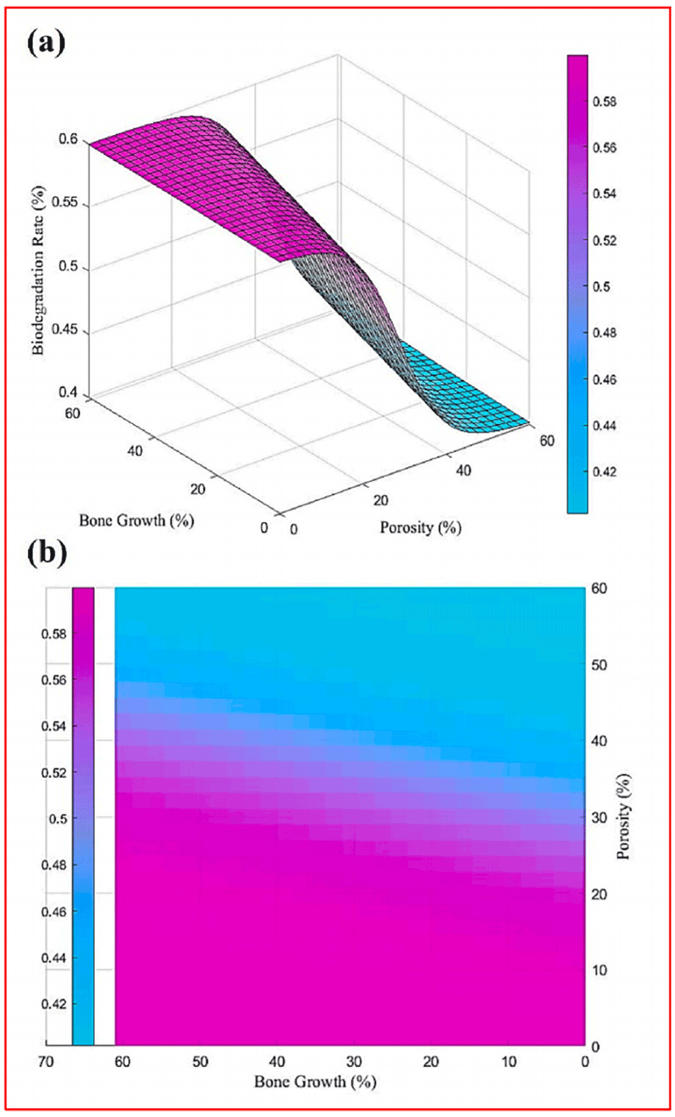图13. 人工神经网络对测试材料生物降解率的预测:a)正视图;b)侧视图。