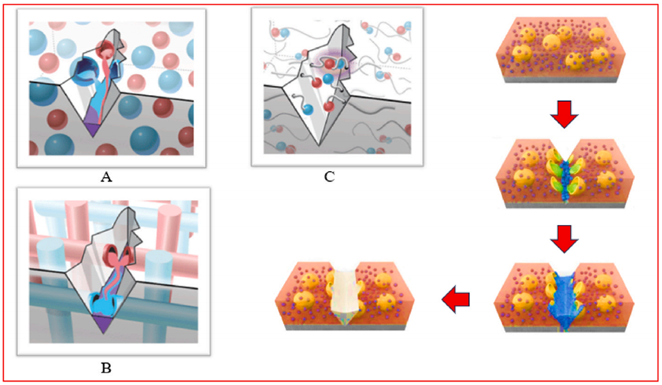 图10. 自修复方法分类:A)胶囊型材料;B)血管型模型;C)固有自修复材料。