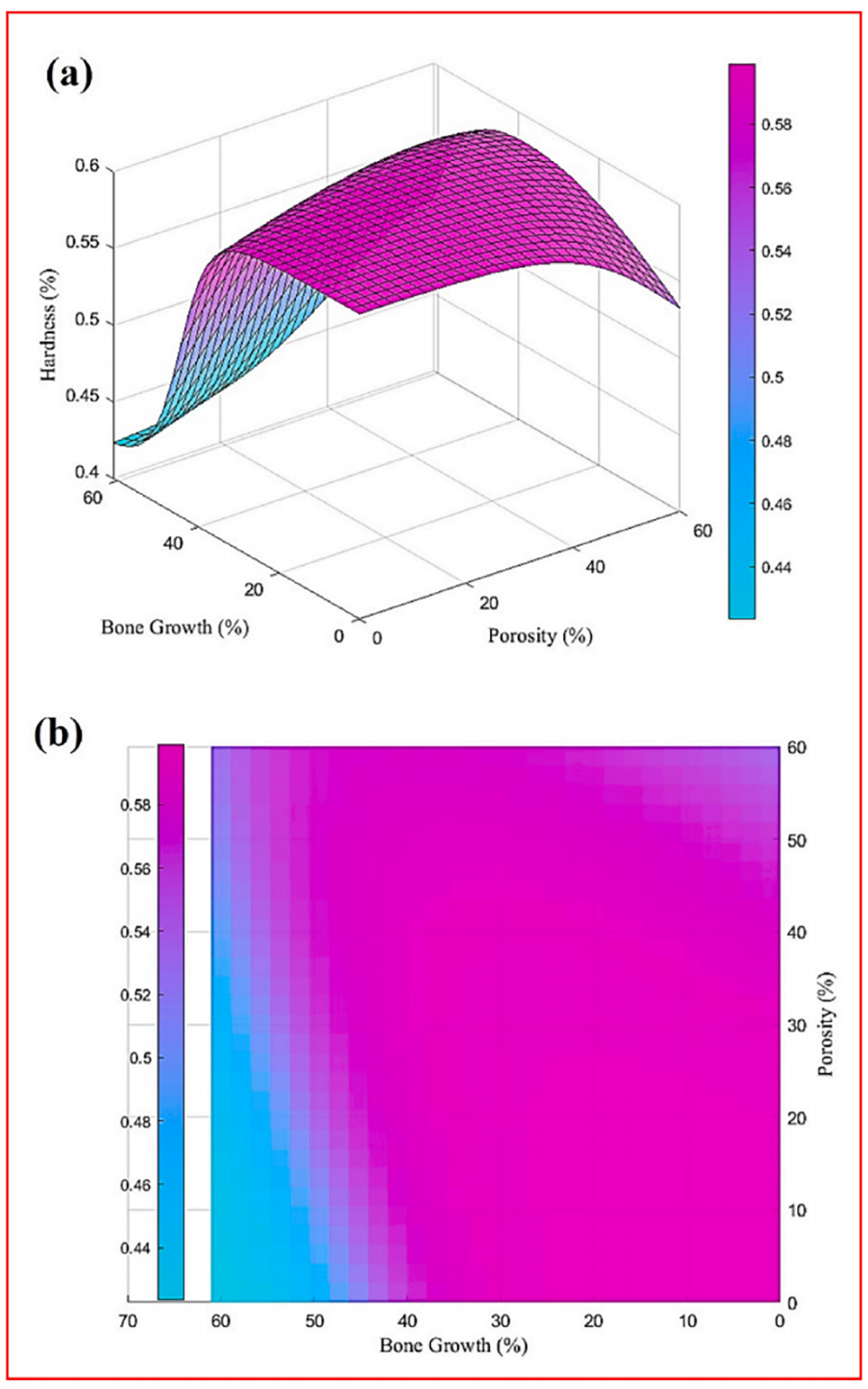 图12. 含隐藏层的人工神经网络(ANN)示意图。该网络包含一个具有5个神经元的隐藏层,以孔隙率百分比和骨生长百分比作为输入,来预测生物降解率、压缩强度和硬度。这代表了一种基于磷酸三钙组织响应的新型生物陶瓷方法。