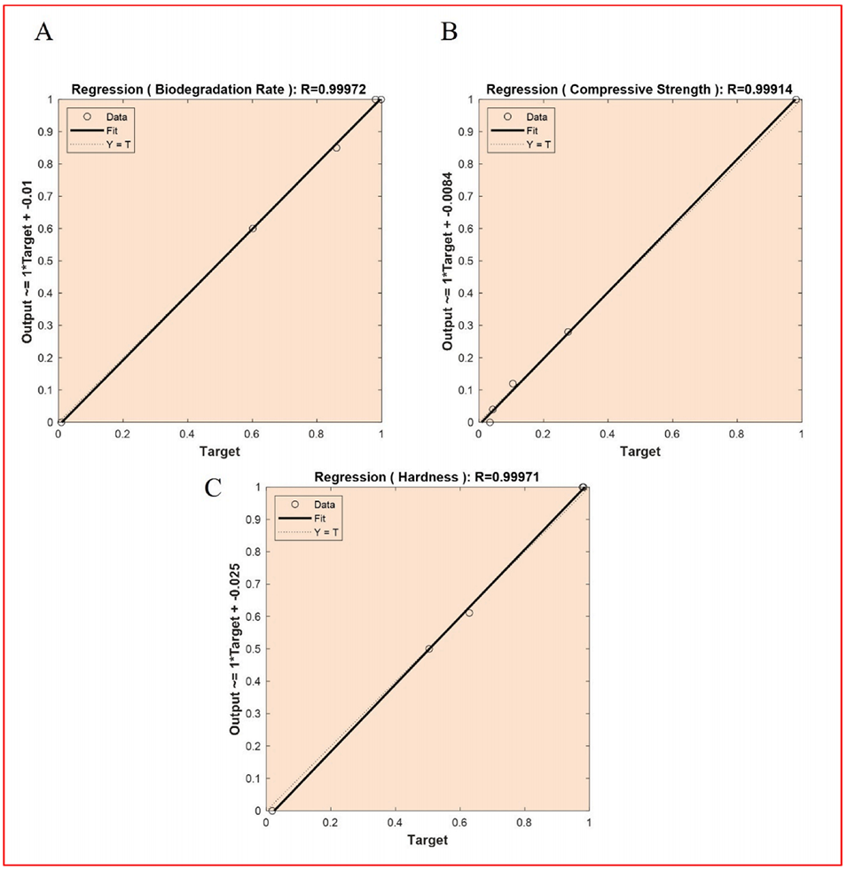 图15. 用于检验本研究构建的人工神经网络误差的线性回归图:a)生物降解率;b)抗压强度;c)硬度。