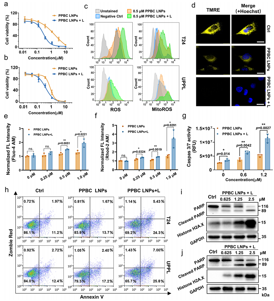 图3: 体外光疗效果评估。a, b: PPBC LNPs在有/无光照下对T24和UPPL膀胱癌细胞的杀伤曲线。c: 流式细胞术分析显示,光照后细胞内活性氧和线粒体活性氧水平显著升高。d: TMRE染色显示,仅PPBC LNPs加光照组线粒体膜电位显著丧失。e, f: 钙离子荧光探针检测显示,光照引发胞内和线粒体内钙离子超载。g: PPBC LNPs介导的光疗显著激活了caspase 3/7。h: Annexin V凋亡检测证实光照诱导了最高水平的细胞凋亡。i, j: Western Blot证实光照后凋亡标志物剪切PARP和DNA损伤标志物H2A.X水平升高。