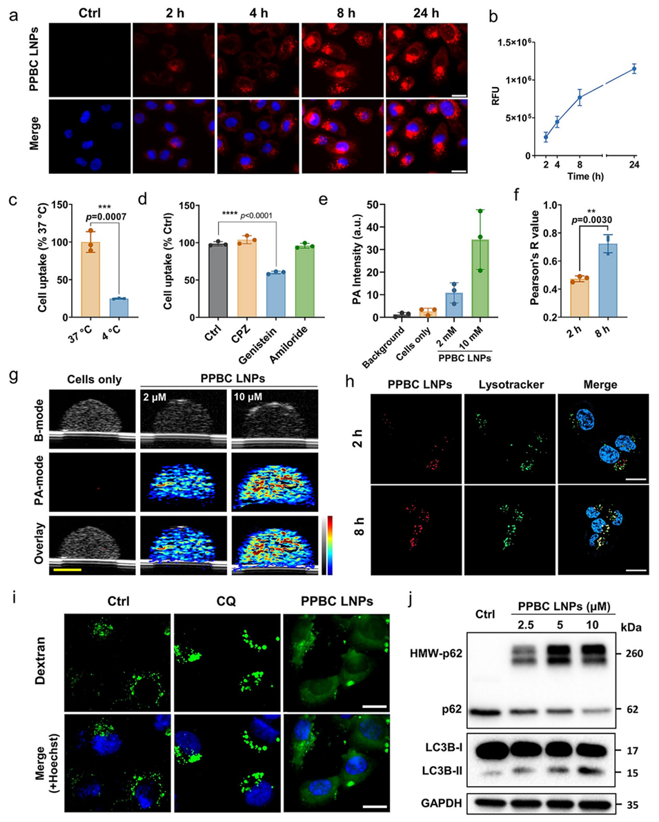 图2: 细胞摄取和抗溶酶体/自噬作用。a, b: T24膀胱癌细胞对PPBC LNPs的时间依赖性摄取荧光图像及定量。c, d: 能量依赖性及不同内吞抑制剂对细胞摄取的影响,证明其主要通过小窝蛋白介导的内吞进入细胞。e, g: 经PPBC LNPs处理的T24细胞在仿体模型中的光声图像及信号定量,显示浓度依赖性PA信号。f, h: PPBC LNPs与溶酶体的共定位分析及皮尔逊相关系数,证明其有效富集于溶酶体。i: 使用Dextran-AF 488评估PPBC LNPs诱导的溶酶体膜透化。j: Western Blot分析显示PPBC LNPs处理后,自噬标志物LC3B-II和高分子量p62的增加,表明自噬被抑制。
