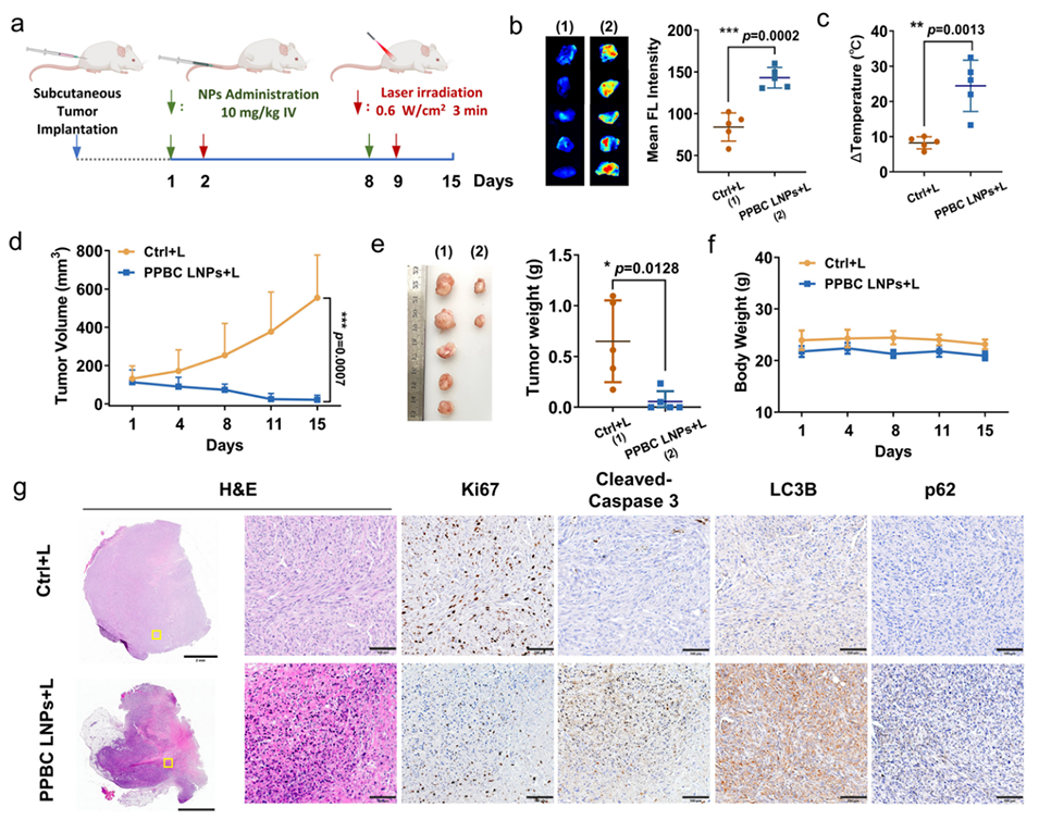 图5: 皮下瘤模型中的光疗效果。a: 皮下膀胱癌模型的治疗时间表。b, c: 离体成像及定量显示,光照后肿瘤内活性氧水平显著升高,并产生显著的光热效应。d, e, f: PPBC LNPs加激光治疗显著抑制了肿瘤生长,部分肿瘤完全消融,且小鼠体重稳定。g: 肿瘤组织的H&E和免疫组化染色显示,治疗组出现组织损伤、细胞增殖减少、凋亡增加和自噬抑制。