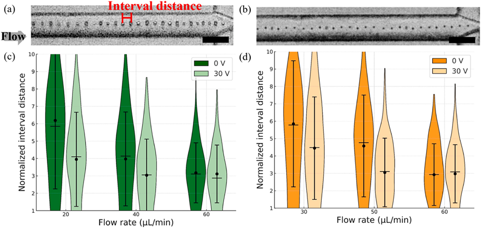 图3. 有序排列粒子的高速相机图像:(a)13μm粒子;(b)6μm粒子;(c)13μm粒子、(d)6μm粒子在不同流速下,施加与不施加PZT电压时的归一化间距(s*=s/d,s为粒子间距,d为粒子直径)及其分布(比例尺:100μm)。