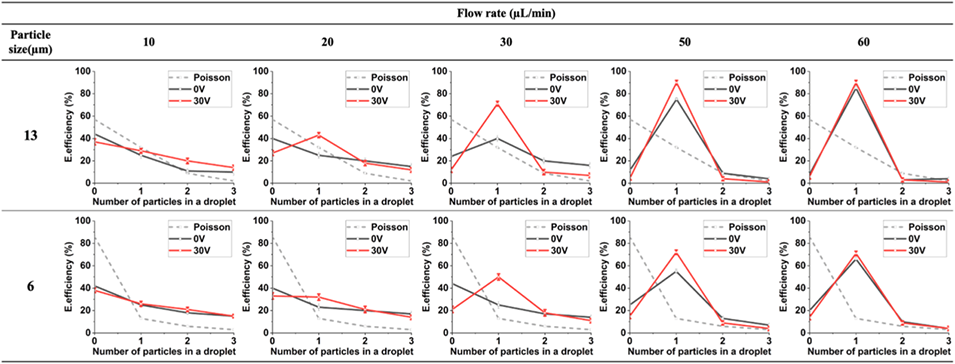 图5. 13μm和6μm粒子在不同实验条件下的液滴封装概率,实验条件包括两种声泳力生成电压(0V和30V)与五种流速(10~60μL/min)。