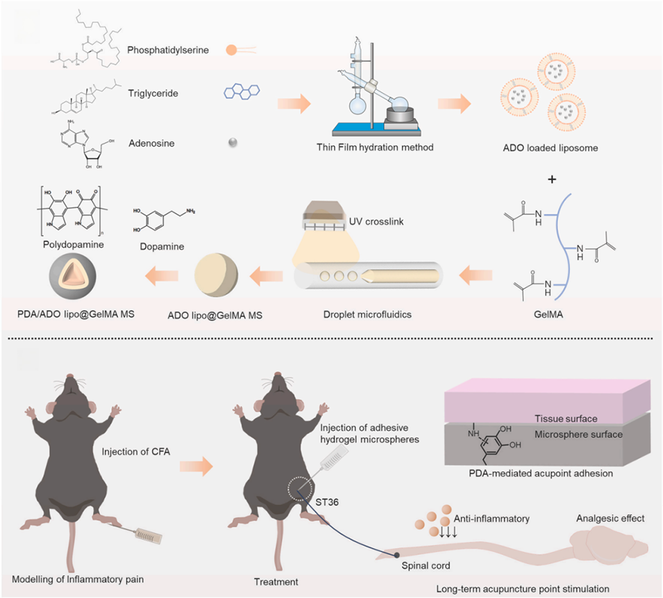 1、本研究开发了一种载腺苷(ADO)的粘性微流控水凝胶微球(PDA/ADO lipo@GelMA MS) 用于疼痛管理。