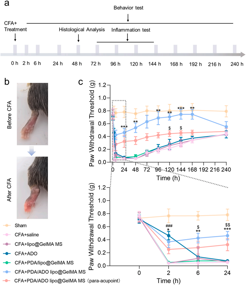 图4. 炎症疼痛模型中的体内镇痛效果评估。a)造模、治疗及疼痛检测的时间线示意图;b)完全弗氏佐剂(CFA)处理后小鼠爪部的照片;c)腺苷(ADO)或各材料处理对完全弗氏佐剂(CFA)模型小鼠爪退缩阈值(PWT)的影响(n=6)。
